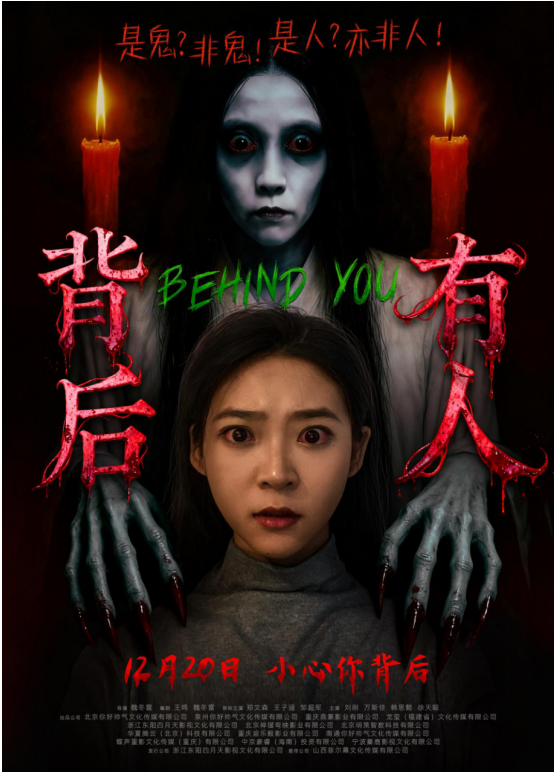 《背后有人》由北京你好帅气文化传媒有限公司、泉州你好帅气文化传媒有限公司、 重庆渝乐毅影业有限公司、龙玺(福建省)文化传媒有限公司等出品,山西菲尔幕文化传媒有限公司宣传,浙江东阳四月天影视文化有限公司发行。这部以“全感官沉浸”打破类型片边界的作品,凭借独树一帜的恐怖表达与电影级质感,成为社交平台“必看惊悚片”榜单TOP1,影片将于12月20日登陆全国院线,为渴望极致刺激的观众献上年度视觉暴击,唤醒集体恐惧!