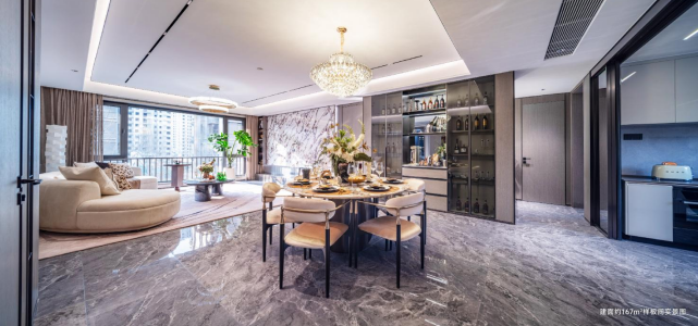 而建面约167㎡四居,采用经典的四叶草户型,实现家庭成员的独立私密空间;约5.3米横厅,搭配超大落地窗,将园林盛景引入室内,打造IMAX级观景体验;多飘窗、宽景阳台等灵动空间设计,进一步拓展生活维度,满足改善家庭多人口、多元化的居住需求。